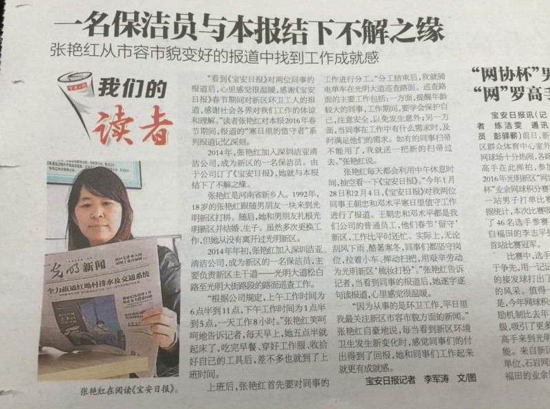 2014年,张艳红加入深圳市洁亚清洁公司,成为新区的一名保洁员,由于公司定了《宝安日报》,她就与本报结下了不解之缘。