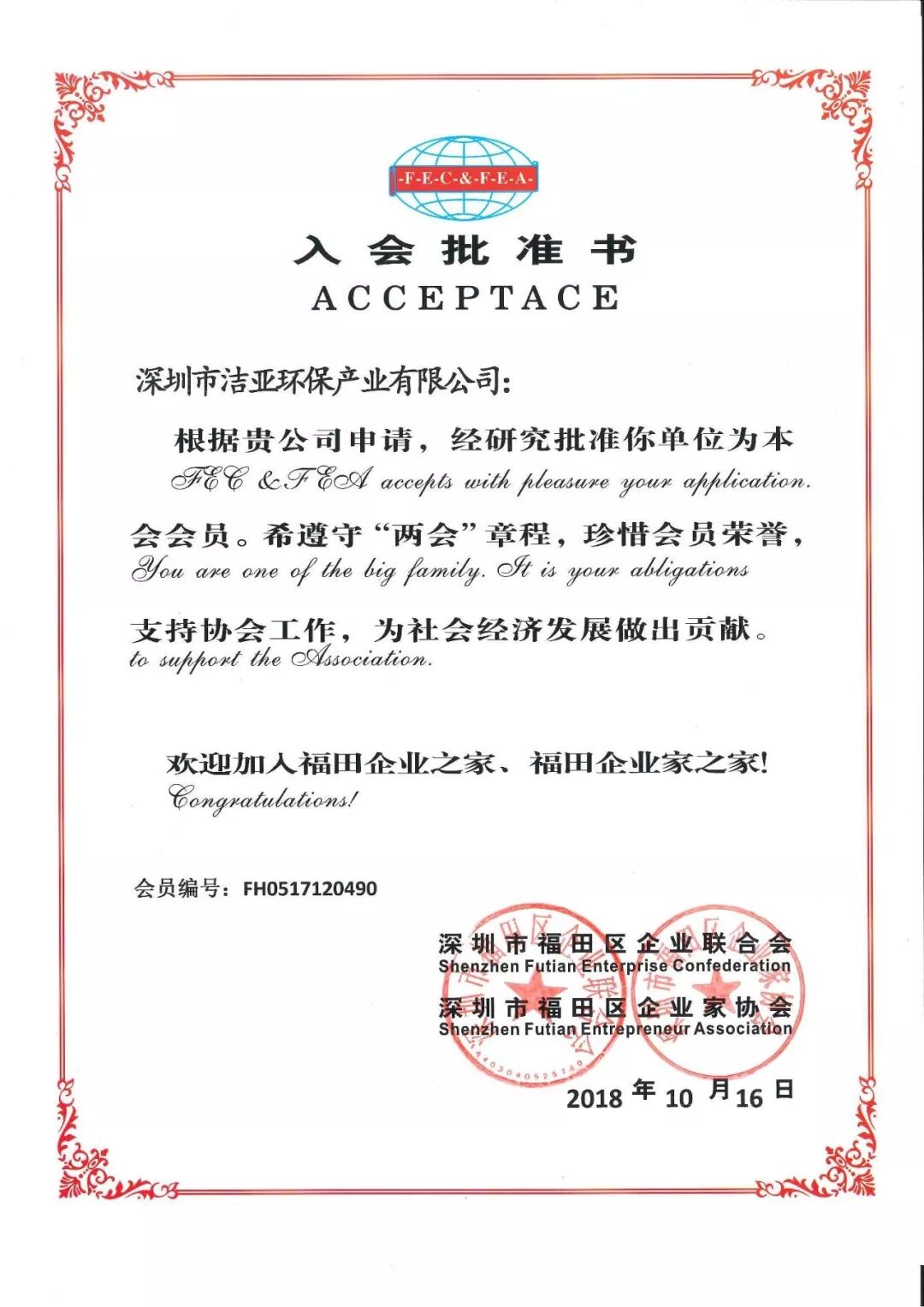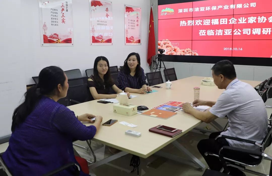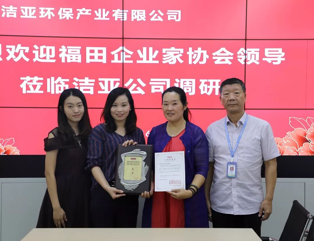 2018年10月16日,深圳市福田区企业联合会、深圳市福田区企业家协会领导莅临洁亚公司,向洁亚公司颁发了会员单位证书和牌匾,双方进行了亲切的座谈。