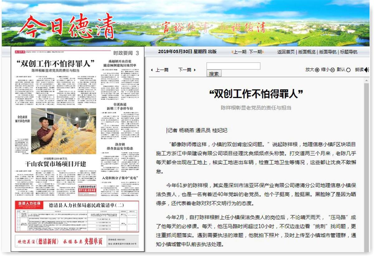 5月30日,《今日德清》时政要闻第3版详细报道了洁亚环保德清项目员工陈祥根的事迹,赞扬他不怕“挑刺”、不怕“得罪人”的双创精神,体现出了一名老党员的责任与担当,他的事迹值得每一位洁亚人学习,原文如下: