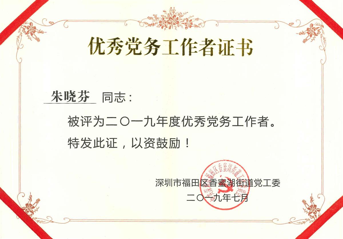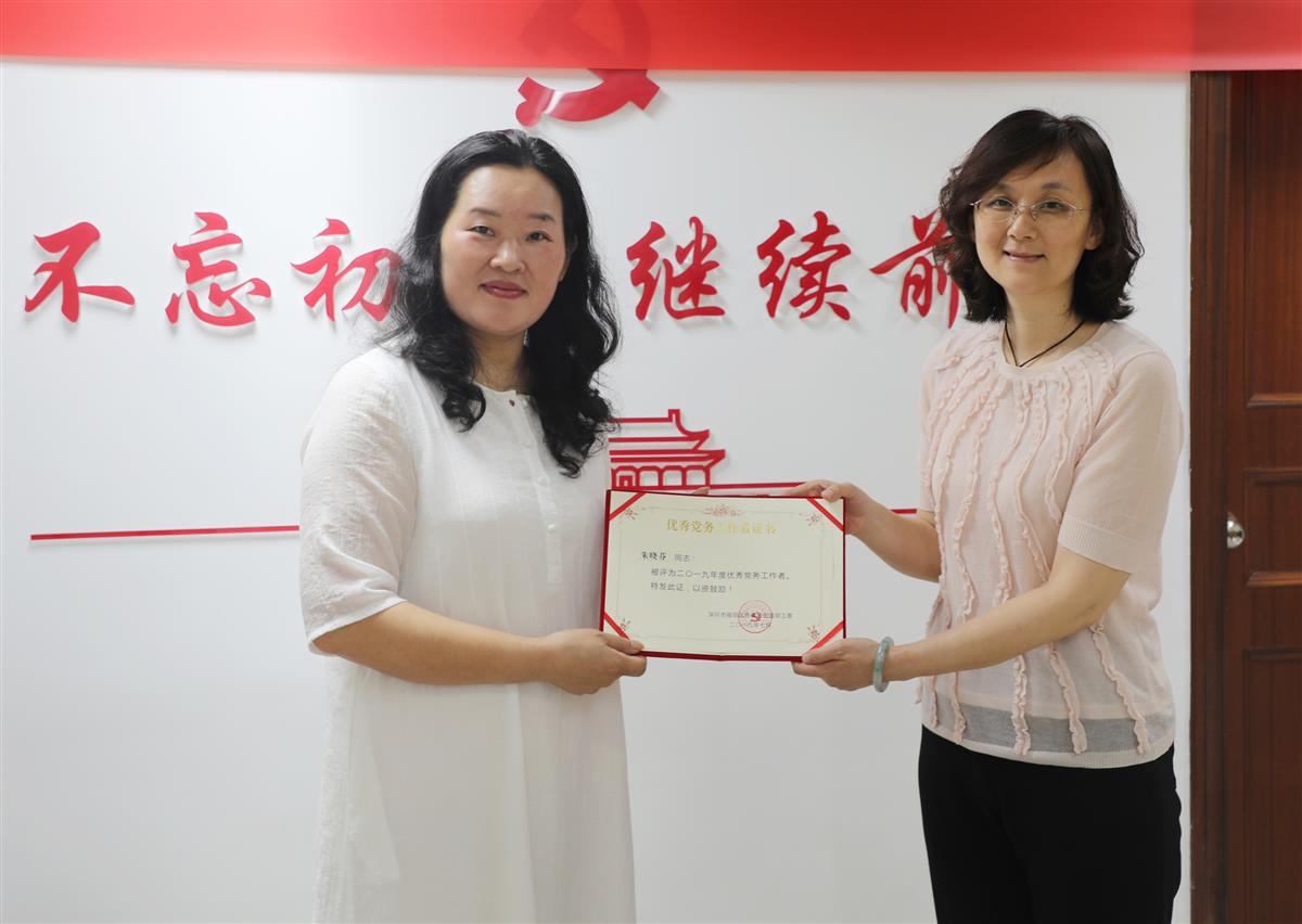 在这火红的七月,中国共产党迎来了建党98周年庆。为表彰先进,树立典型,七月一日,中共深圳市福田区香蜜湖街道党工委隆重表彰了2019年优秀个人和先进党组织。在此次表彰大会上,洁亚党支部荣获“2019年先进基层党组织”称号,洁亚党支部朱晓芬书记被评为“2019年优秀党务工作者”。竹林社区党委书记廖伟红为朱总颁发了荣誉奖牌和证书。