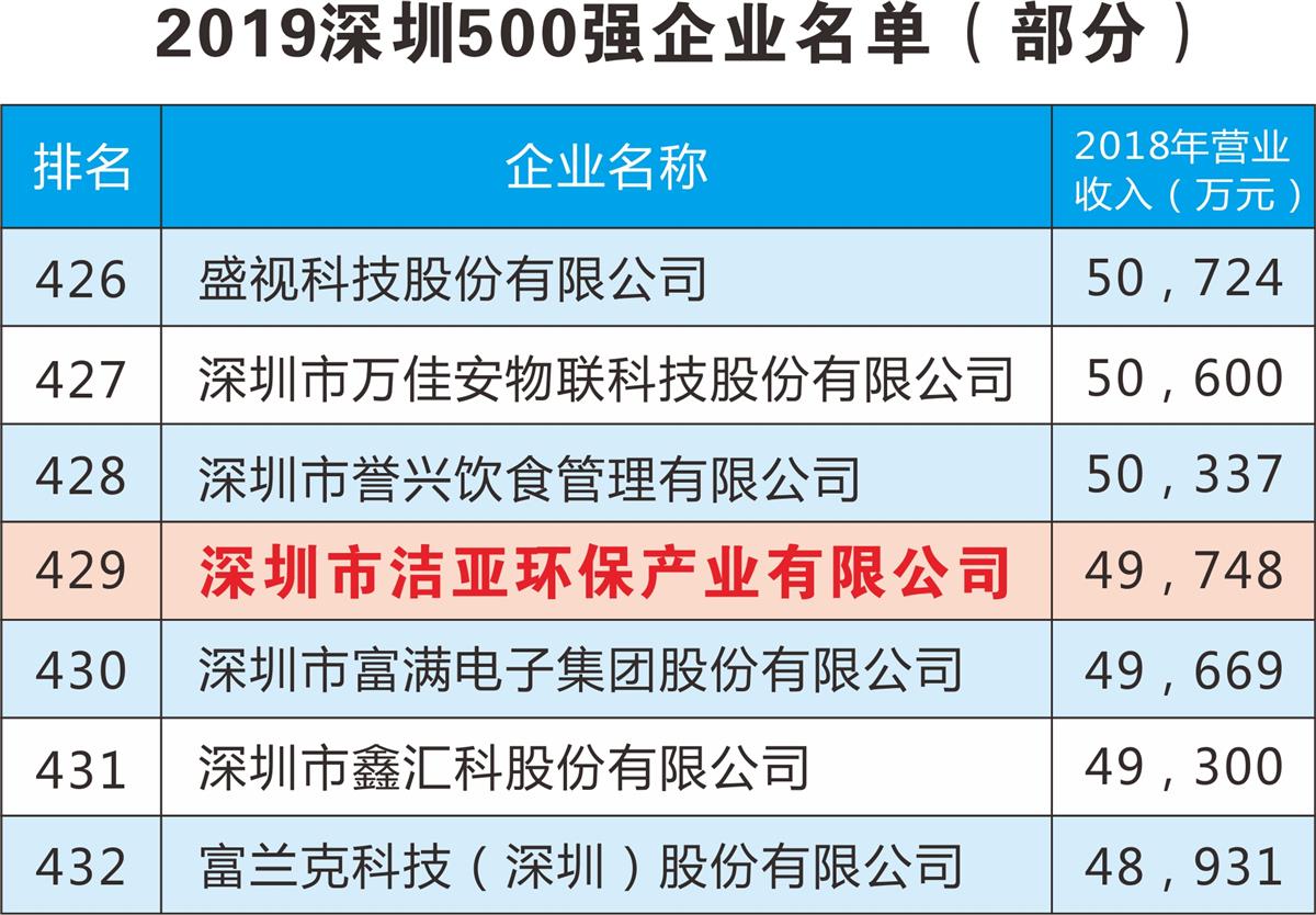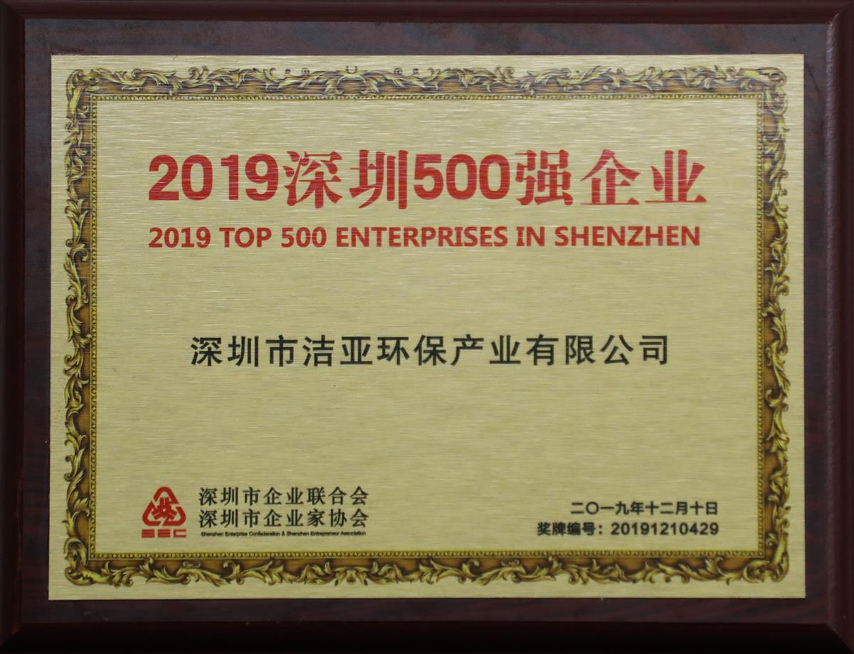7月30日, “2019深圳500强企业”名单正式予以公示,深圳各大媒体争相报道。8月5日,公示正式结束,洁亚环保再次获评“2019深圳500强企业”,并且排名比去年同比上升11位。这是洁亚环保得到社会各界的充分肯定和实力的见证,也是洁亚人敢为人先、奋力拼搏、共同努力的结果
