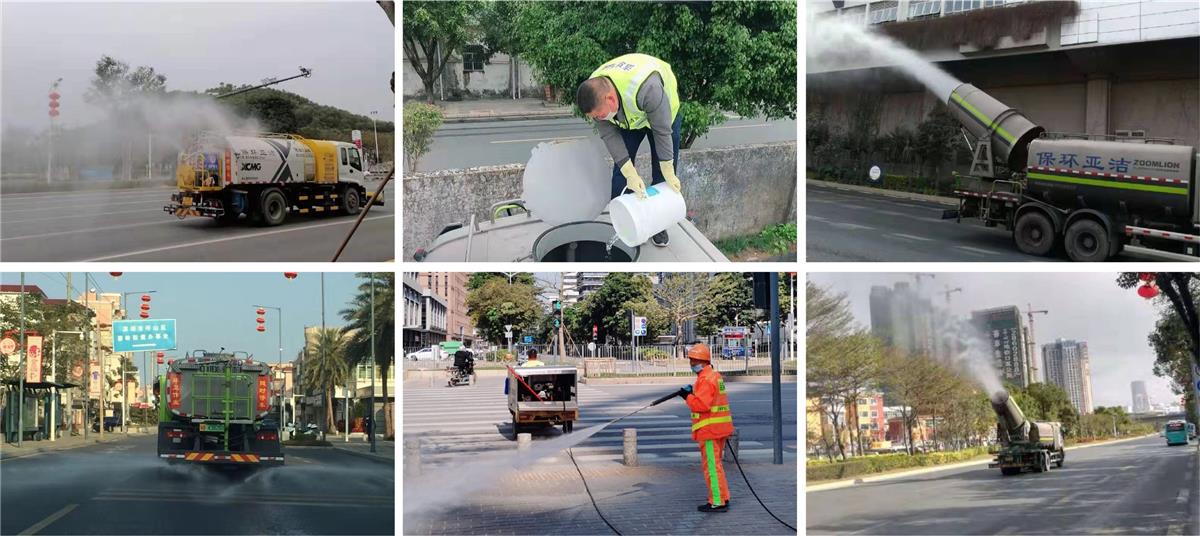 3、路面消毒方面:各项目使用大型水车、雾炮车加注消毒液、消毒粉对主干道、机动车道、辅道、绿化带进行全面消毒。每天对红绿灯路口约3000平方米范围内进行消毒2次。在疫情严重地区,安排人员适当加班,加强消毒频次。