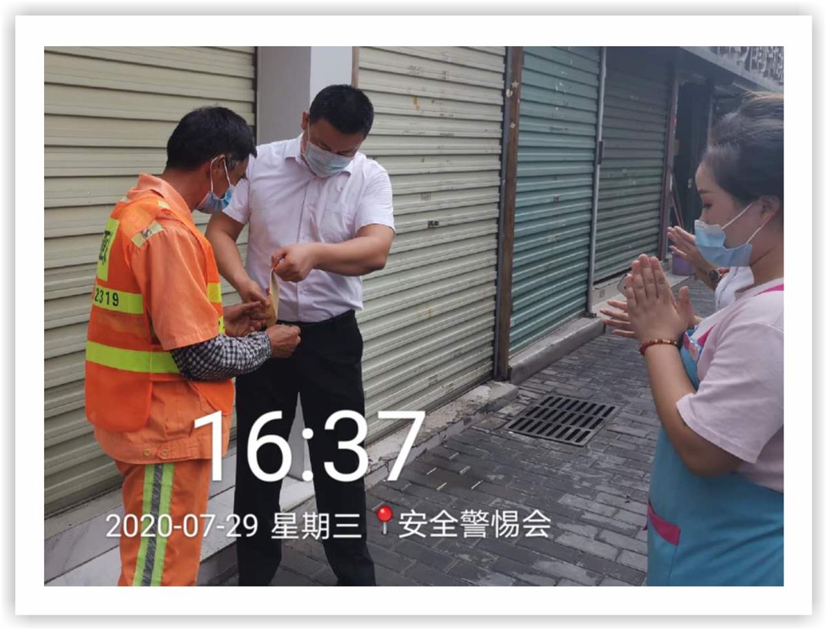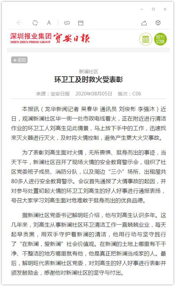 8月5日,《宝安日报》报道了我司观澜项目环卫工人刘高生挺身而出、英勇无惧,及时扑灭火情的英勇事迹。7月29日上午,在观澜新澜社区一处市政电线着火,刘高生及时发现火情并临危不乱,及时将火情控制,避免了火势的蔓延,保护了人们生命财产安全,受到了当地社区党委的表彰,事件如下: