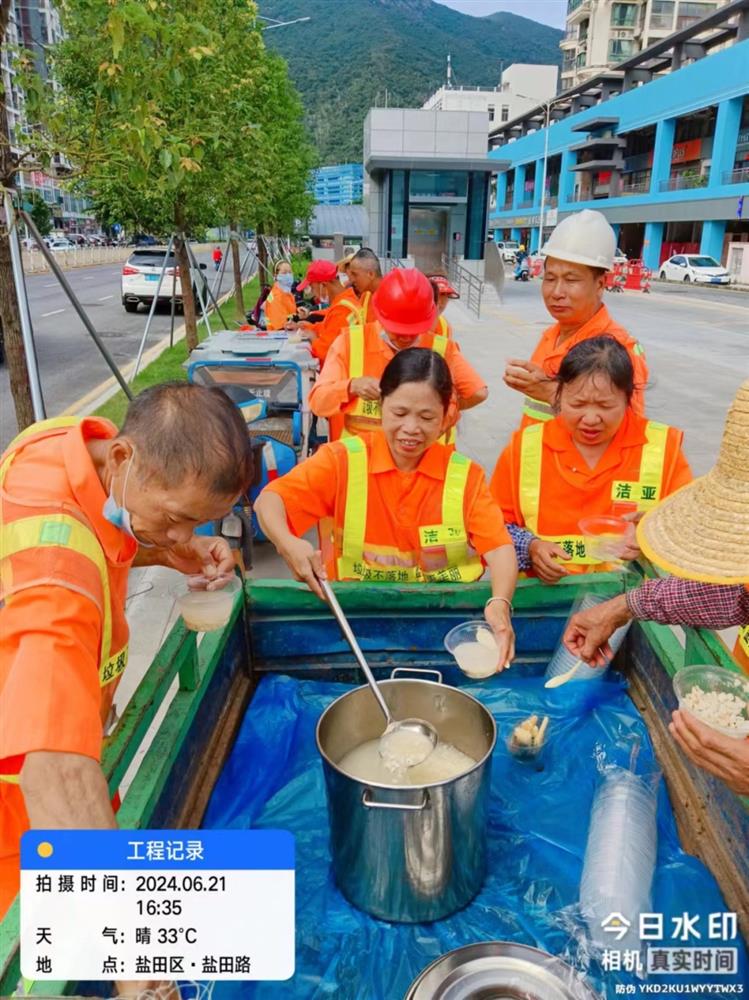 为应对高温天气,确保一线环卫作业人员安全有序开展工作,洁亚环保通过增加机械化清扫频次、合理调整工作时间等方式降低环卫工人劳动强度,减少一线环卫工人在高温环境下户外作业时间,并充分利用爱心驿站为环卫工人遮阳、休息、喝水、降温等提供便利条件。洁亚环保项目办公室常备饮用水、人丹、十滴水、风油精、藿香正气水等防暑降温药品,并及时发放给一线环卫工人,同时要求管理员巡查卫生时随身携带应急药品,全方位用“心”助力安全生产。