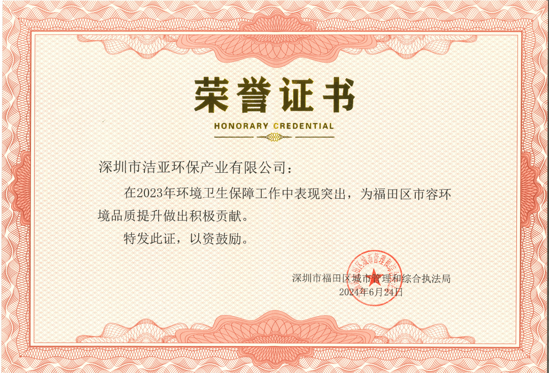 近日,深圳市福田区城市管理和综合执法局特向洁亚环保颁发荣誉证书,高度赞扬洁亚环保在2023年度环境卫生保障工作中的卓越表现与杰出贡献,对福田区市容环境品质提升做出了积极的贡献。