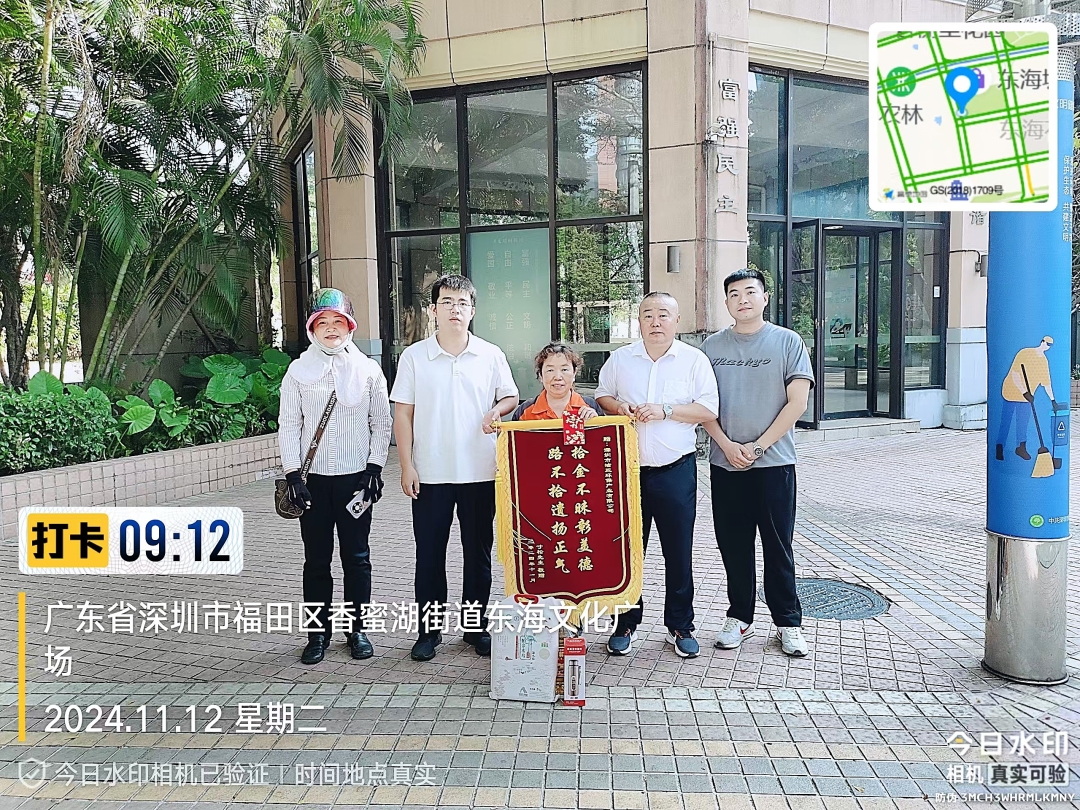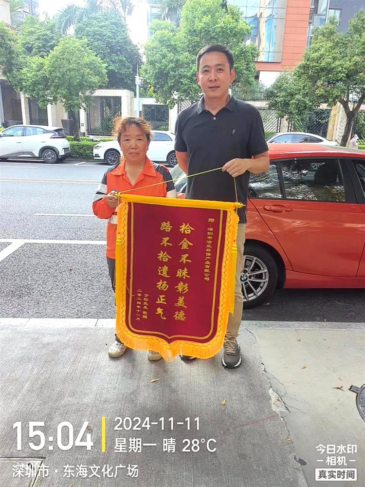 为表达对朱阿姨高尚品德的敬意,11月11日,失主特制一面锦旗,上面刻有“拾金不昧彰美德,路不拾遗扬正气”的赞语,亲自送到公司赠予朱阿姨。面对这份厚礼,朱阿姨略显羞涩,表示这只是自己应该做的事,没想到会得到如此赞誉。她希望自己的行为能传递正能量,引导更多人遇到类似情况时选择归还失物,共同营造诚信、友善的社会氛围。