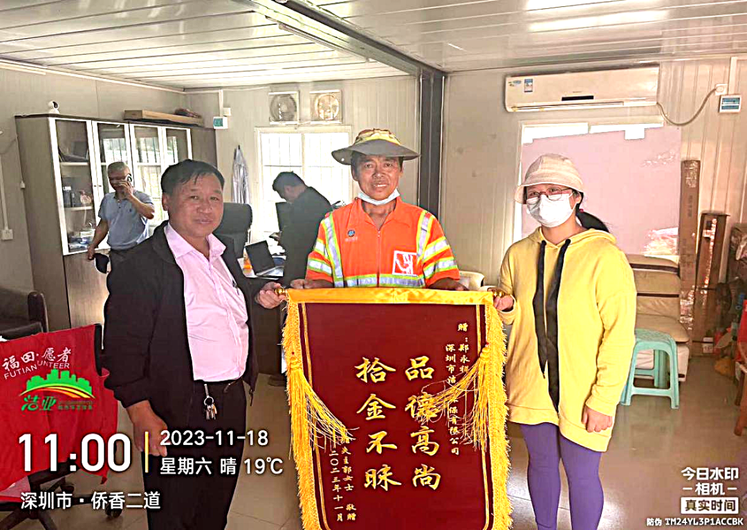 此外,洁亚环保香蜜湖街道项目的郑永祥同志,在下班途中拾获一部贵重手机,并毫不犹豫地归还给了失主,同样也获得了失主的锦旗感谢。
