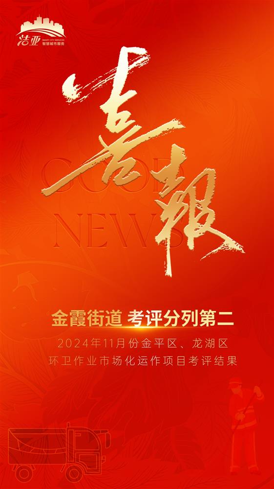 近日,2024 年 11 月金平区、龙湖区环卫作业市场化运作项目考评结果揭晓,洁亚环保负责的金霞街道合同标段,在金平区与龙湖区环卫保洁作业市场化项目中脱颖而出,荣膺第二名,获管理部门高度赞誉。