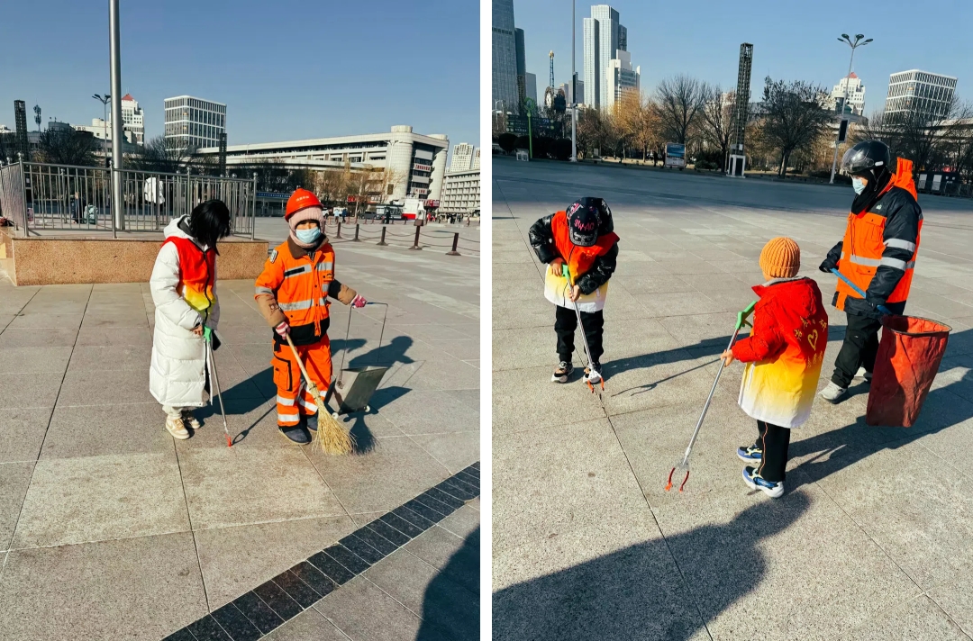 活动现场,志愿者们热情高涨,有序参与环境清洁工作。一位身着白色外套的志愿者女孩,手持清扫工具,专注清扫地面,不放过任何角落;与之配合的洁亚环保员工头戴橙色安全帽,右手紧握垃圾夹子,仔细捡拾杂物,二者默契协作,成为广场上一道亮丽风景线。令人惊喜的是,志愿者队伍中有两个 6、7 岁的孩子,他们认真地用垃圾捡拾器清理地面垃圾,专注的神情彰显着志愿服务精神的传承。洁亚环保员工则拿着红色垃圾袋,协助收纳垃圾,共同维护公共空间的清洁。