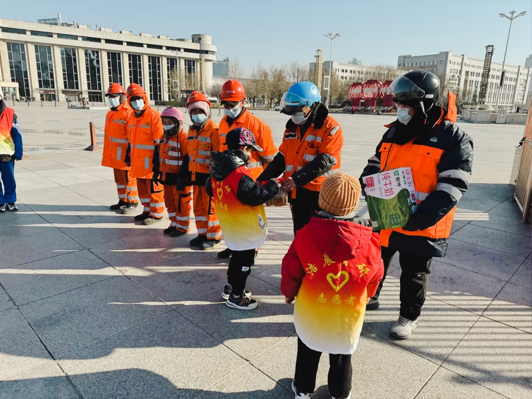 此次活动不仅聚焦环境清洁,更充满温情。志愿者们自发采购物品赠予洁亚环保一线员工。孩子们为一线环卫工人分发物品,纯真的笑容和一声声 “谢谢叔叔阿姨”“你们辛苦了”,让一线员工在寒冬中感受到温暖与关怀。