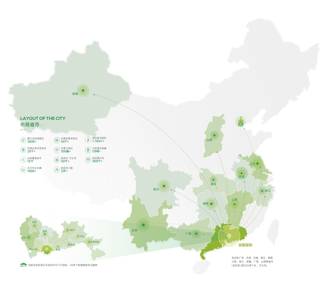 自 2002 年于深圳成立,洁亚环保二十余载深耕清洁服务领域。目前,已在全国 13 个省(直辖市 / 自治区)设立 50 余家分支机构,服务网络覆盖超百座城市,运营近百个城市服务项目,服务规模稳居全国前列。凭借专业团队与先进管理,打造 200 余个标杆项目,为行业树立典范。同时,圆满完成广州亚运会、深圳大学生运动会等国际大型展会和赛事的环境保障任务,获各地政府高度赞誉,彰显社会责任与服务品质。